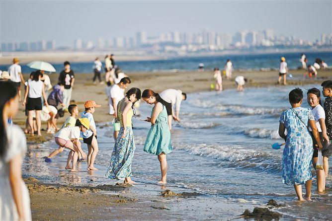 环东浪漫线、环岛路等区域的沙滩上人头攒动,欢声笑语不断。市民游客携家带口在这里踏浪戏水,孩子们拿着铲子和水桶,专心致志地建造着他们的“沙堡王国”。来自成都的摄影爱好者高先生此次假期特地来到厦门拍照,“山、海、城融合,随处都能取景。”他对厦门赞不绝口。