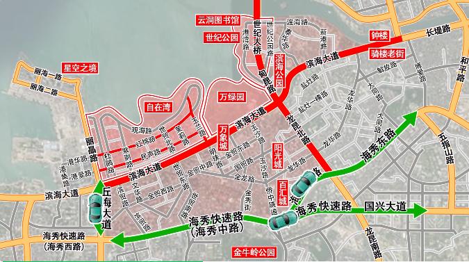 途经社会车辆视情绕行海秀快速路、海盛路,避开滨海大道及南侧车辆集中路段。