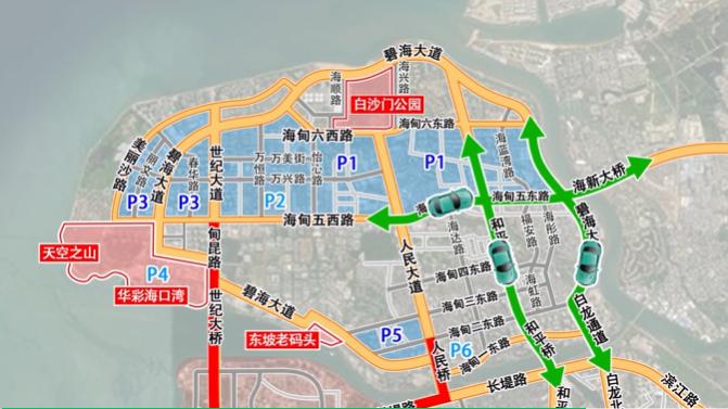 途经社会车辆视情绕行和平桥、白龙通道、海新大桥进出岛,避开世纪大桥、人民桥等车辆集中路段。