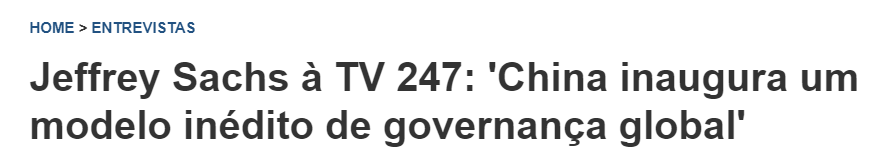 巴西247新闻网近日刊登一篇文章,介绍了世界知名学者杰弗里·萨克斯接受巴西247电视台专访时,对中国提出的全球治理倡议予以高度评价。他认为,“中国开创了前所未有的全球治理模式”。